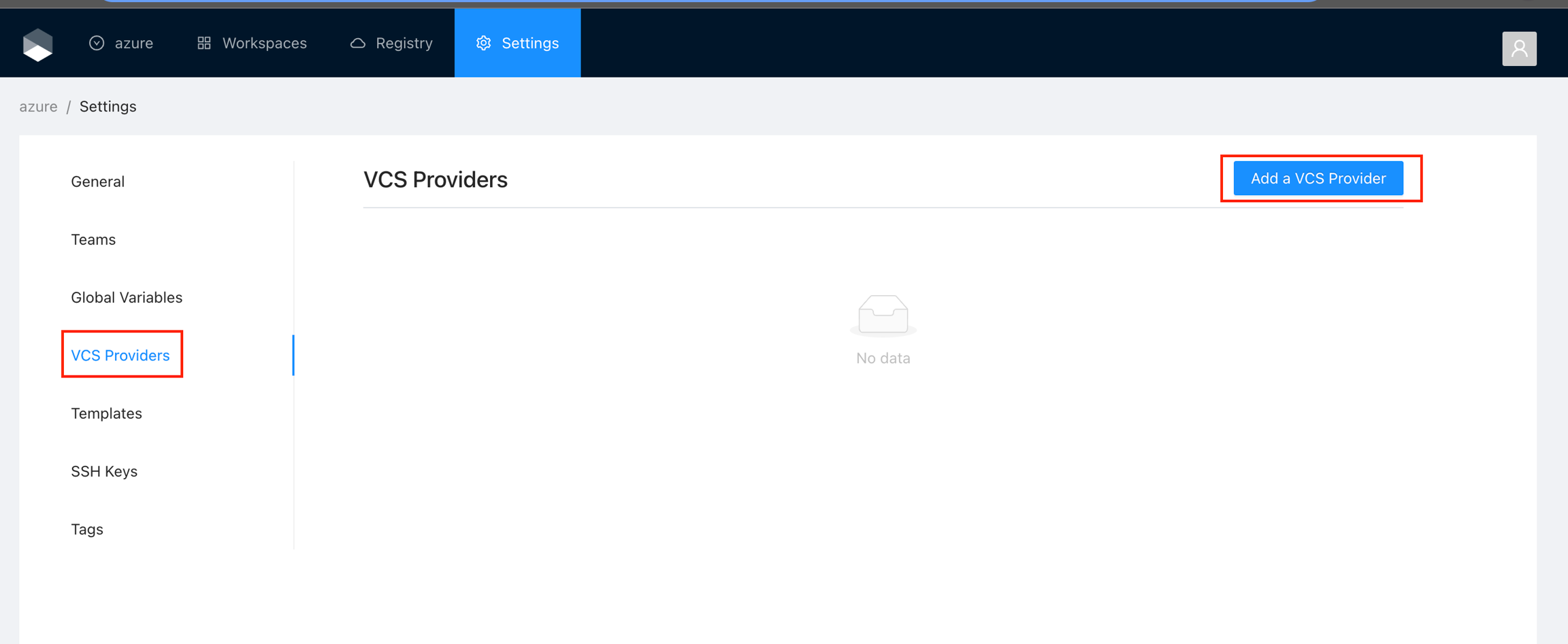 Got to the organization settings you want to configure. Select the VCS Providers on the left menu and click the Add VCS provider button on the top right corner..