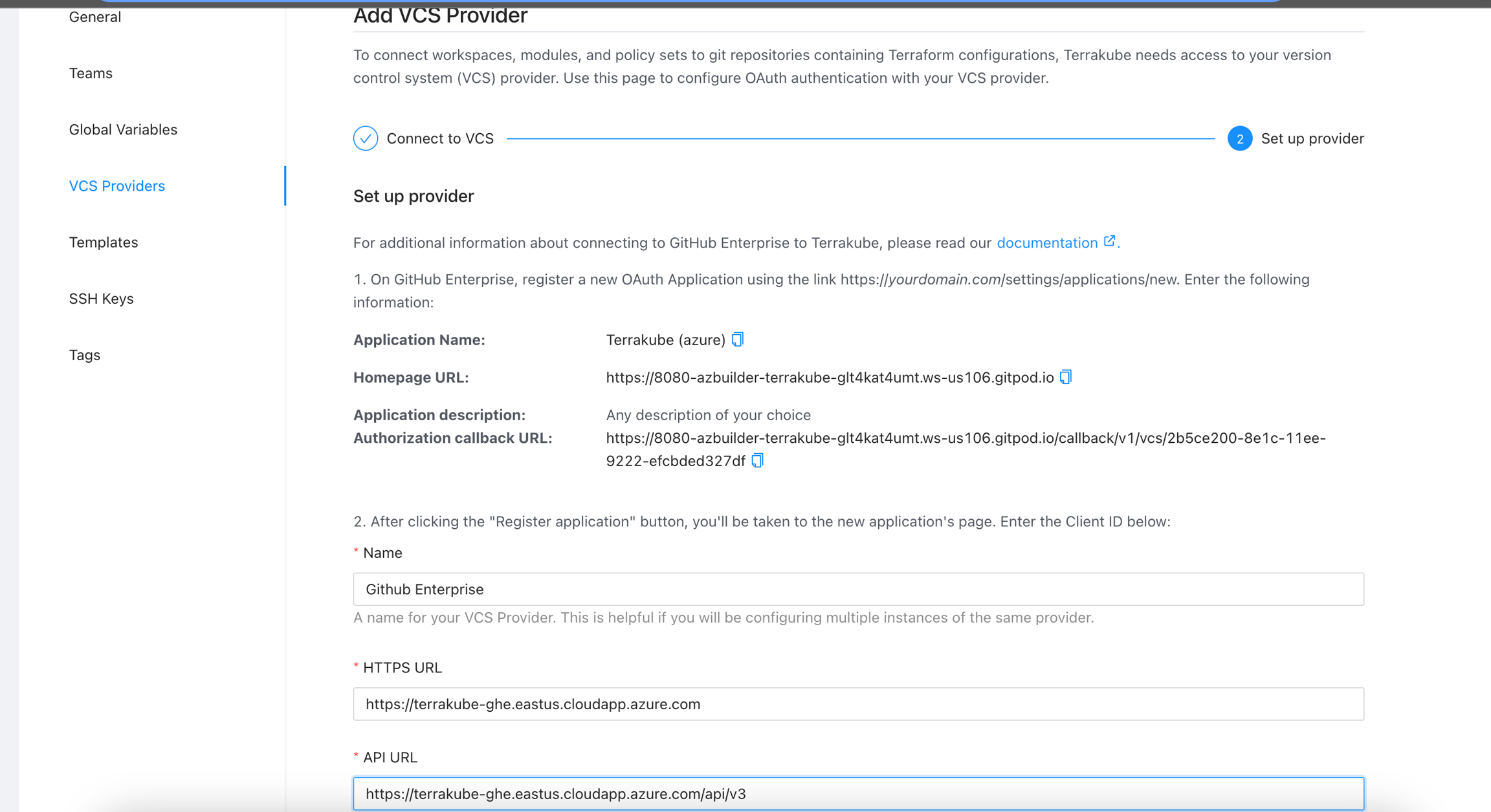 You can complete the fields using the information suggested by terrakube in the VCS provider screen