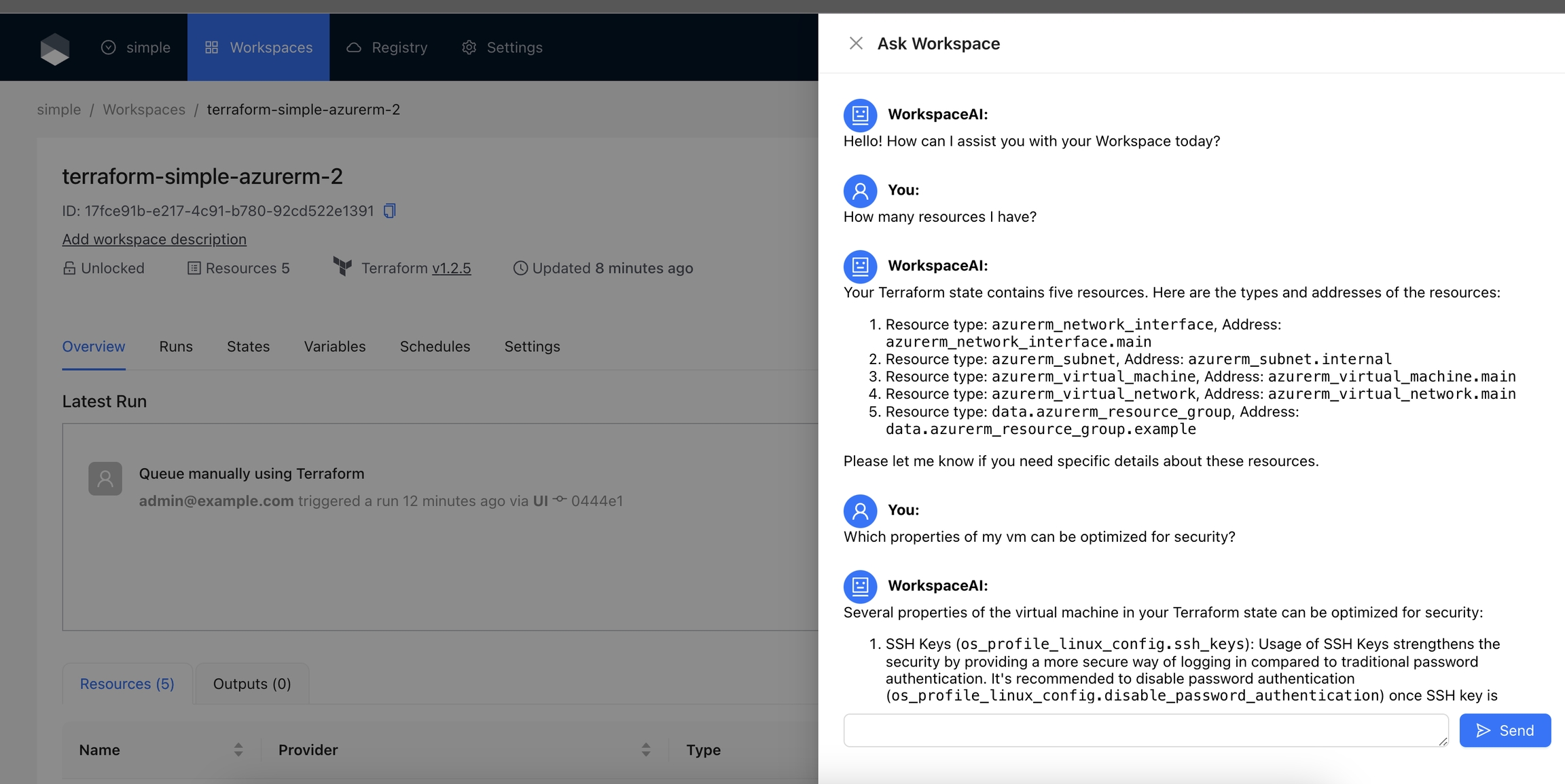 The Ask Workspace action allows users to interact with OpenAI's GPT-4o model to ask questions and get assistance related to their Terraform Workspace. This action provides a chat interface where users can ask questions about their Workspace's Terraform state and receive helpful responses from the AI.