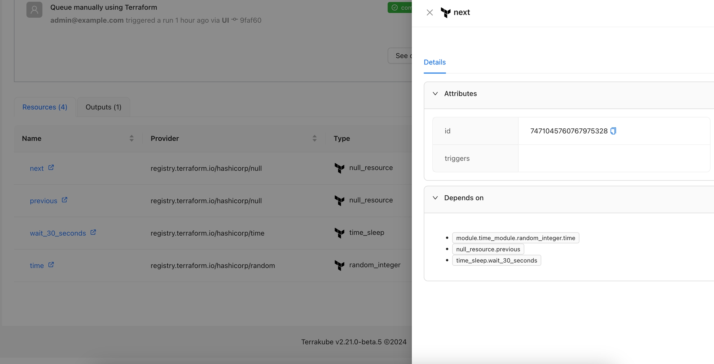 The Resource Details action is designed to show detailed information about a specific resource within the workspace. By using the context of the current state, this action provides a detailed view about the properties and dependencies in a tab within the resource drawer.