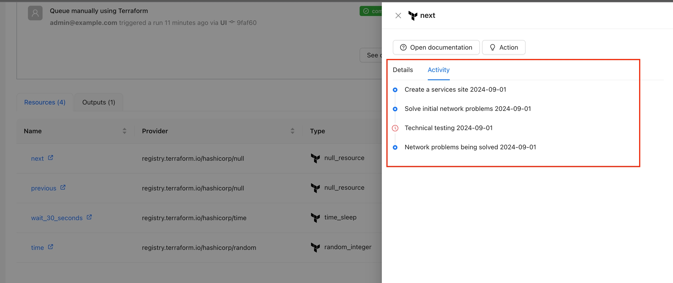 The action will appear for each resource when you click on a resource using the Overview Workspace page or the Visual State Diagram. Use this when you want to display additional data for the resource, such as activity history, costs, metrics, and more.