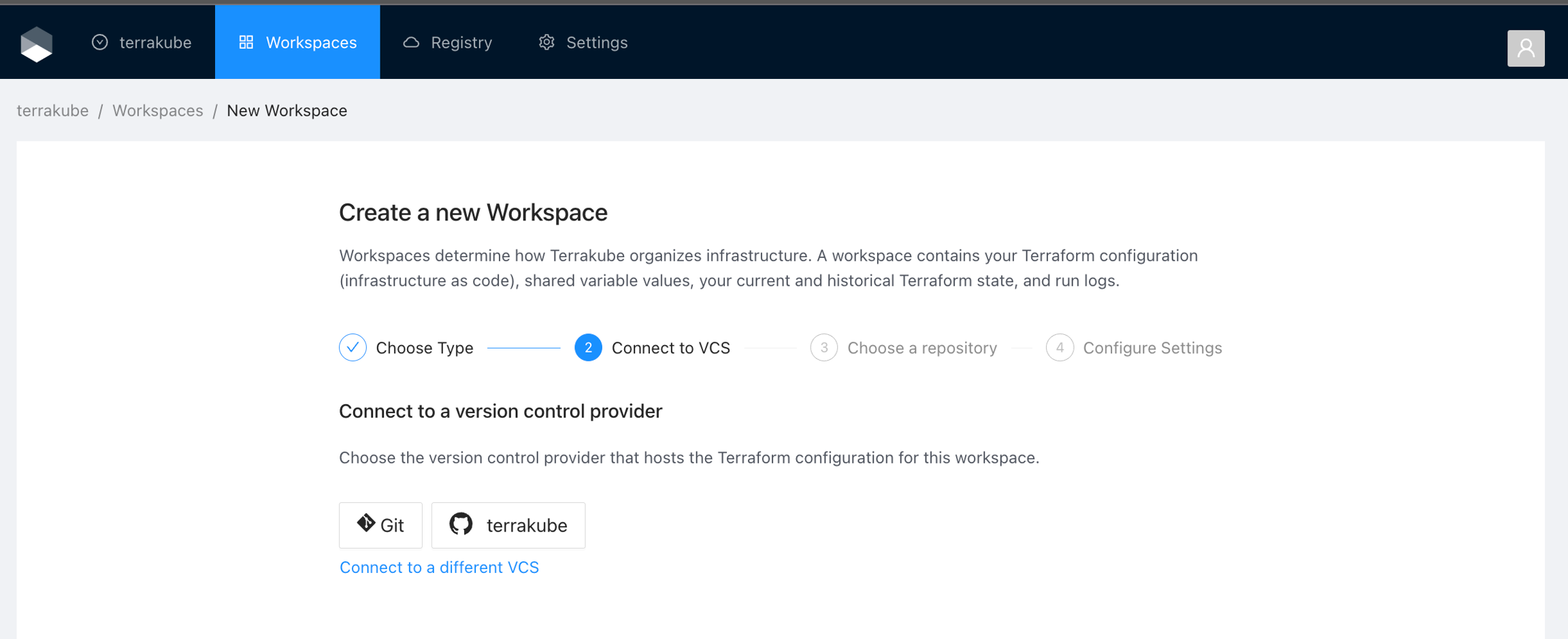 Select an existing version control provider or click Connect to a different VCS to configure a new one. See VCS Providers for more details.