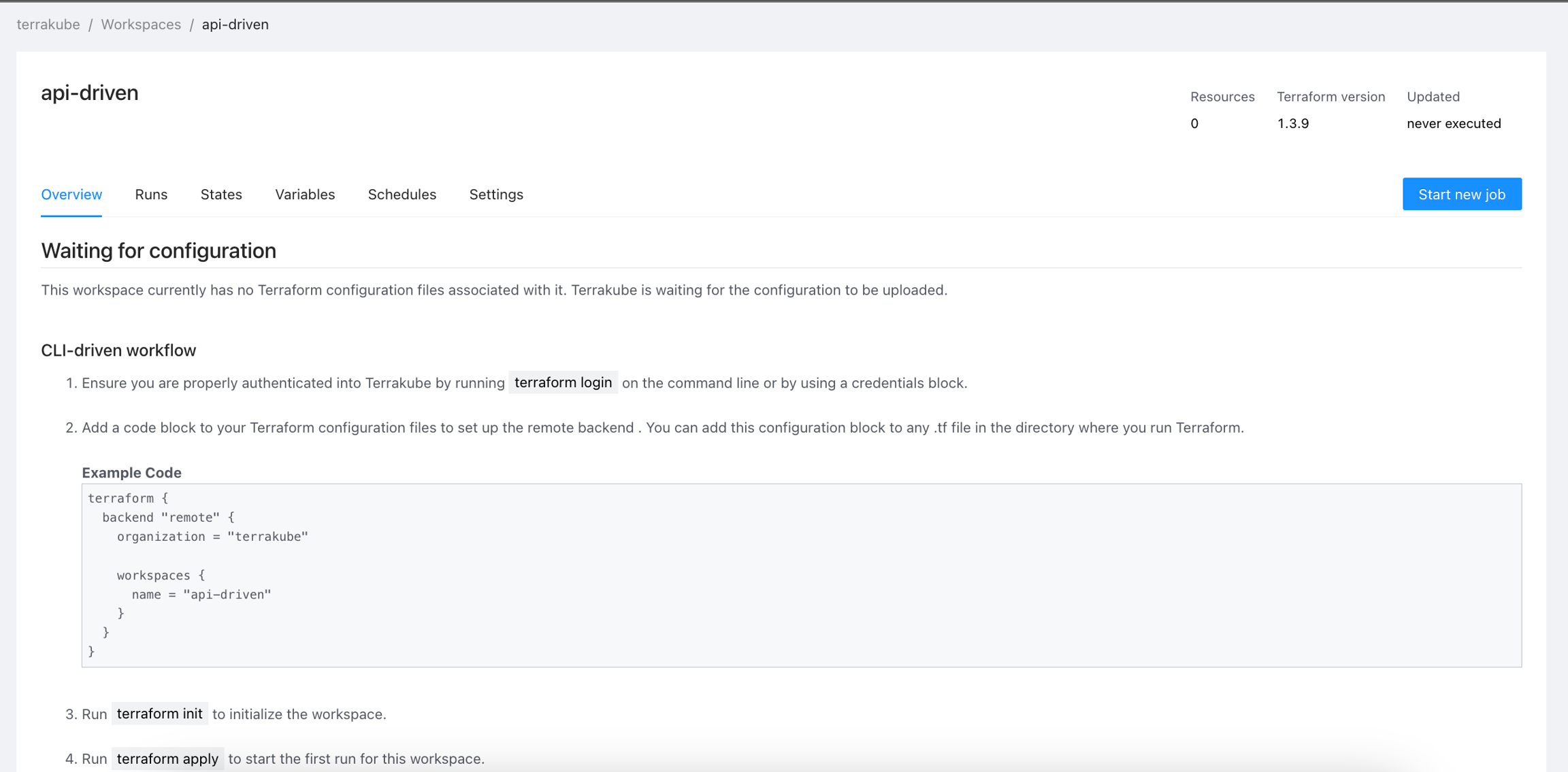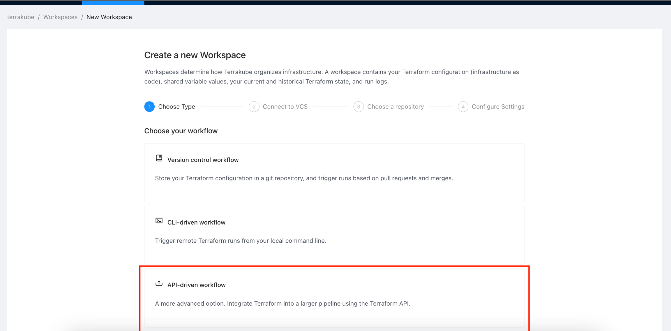 API-driven workflow: A more advanced option. Integrate Terraform into a larger pipeline using the Terrakube API.