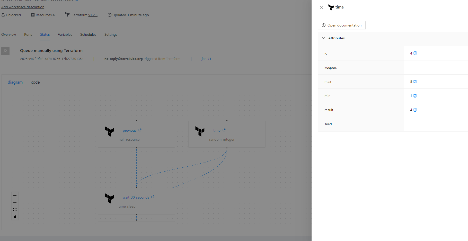 Each Terrakube workspace has its own separate state data, used for jobs within that workspace. In Terrakube you can see the Terraform state in the standard [JSON format](#json-state) provided by the Terraform cli or you can see a [Visual State](#visual-state), this is a diagram created by Terrakube to represent the resources inside the JSON state.