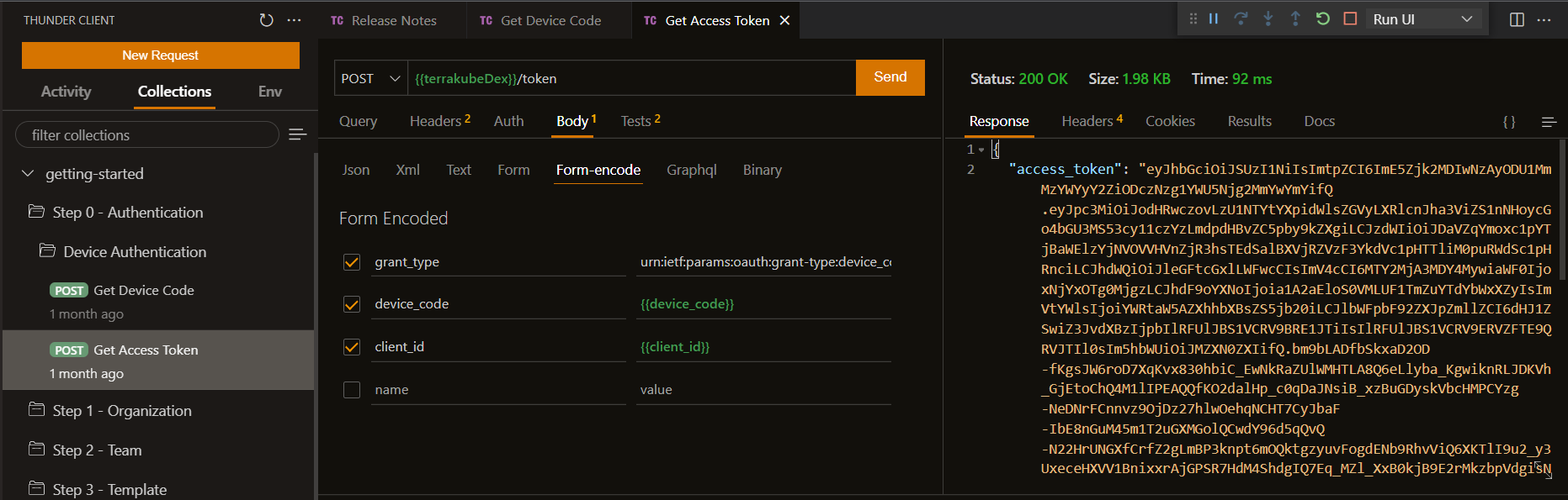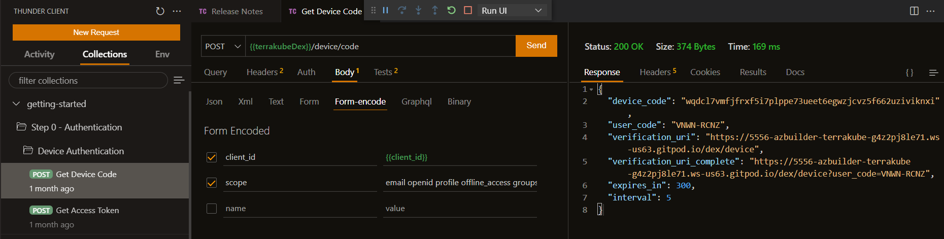 Execute the request "Get Device Code" and open the URL in field "verification\_uri\_complete" inside the response to get the authentication token