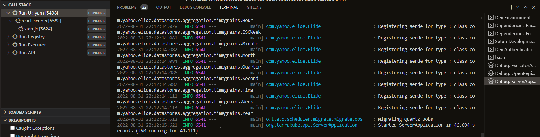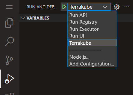 After a couple of seconds the Gitpod environment will be ready and you will need to start the API, to do this just select "Run and Debug" in the left menu in VS Code and start the application using the "Terrakube" option
