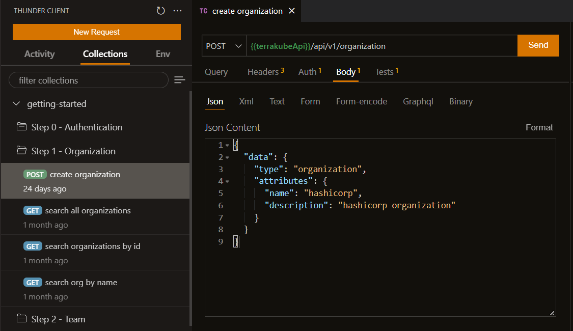 To create it we will use the request inside the collection "Step 1 - Organization"