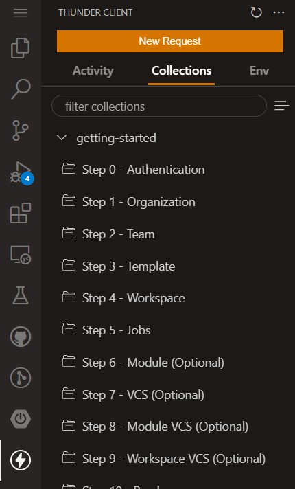 Now you can select the "Thunder Client" and open the "Getting Started" collection to test the API