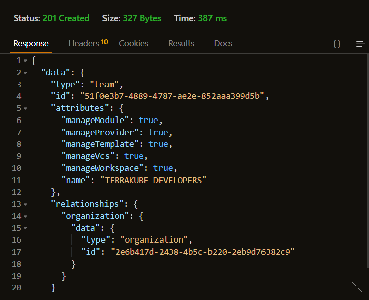 This will create a team called "TERRAKUBE\_DEVELOPERS" with access to all the features and you should get a response like the following: