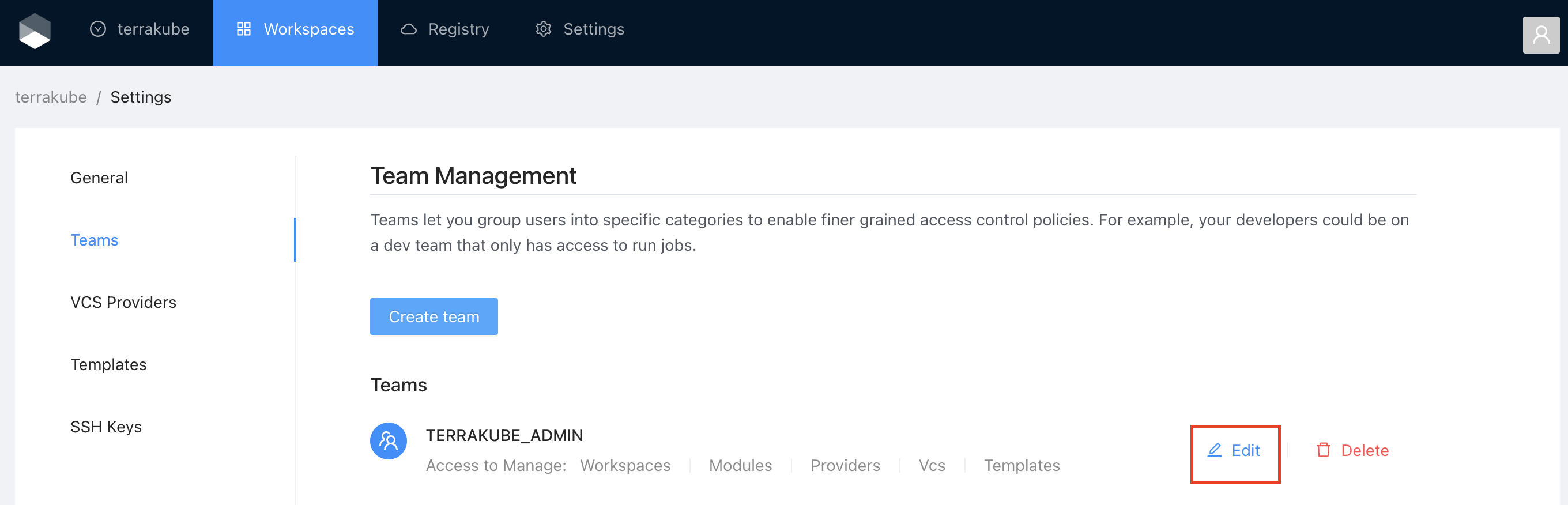 <table><thead><tr><th width="341">Field</th><th>Description</th></tr></thead><tbody><tr><td>Name</td><td><p>Must be a valid group based on the Dex connector you are using to manage users and groups.</p><p>For example if you are using Azure Active Directory, you must use a valid Active Directory Group like TERRAKUBE_ADMIN, or if you are using Github the format should be MyGithubOrg:TERRAKUBE_ADMIN</p></td></tr><tr><td>Manage Workspaces</td><td>Allow members to create and administrate all workspaces within the organization</td></tr><tr><td>Manage Modules</td><td>Allow members to create and administrate all modules within the organization</td></tr><tr><td>Manage Providers</td><td>Allow members to create and administrate all providers within the organization</td></tr><tr><td>Manage <a href="templates">Templates</a></td><td>Allow members to create and administrate all <a href="templates">templates</a> within the organization</td></tr><tr><td>Manage <a href="../vcs-providers">VCS Settings</a></td><td>Allow members to create and administrate all <a href="../vcs-providers">VCS Providers</a> within the organization</td></tr><tr><td>Manage State</td><td>Allow members to see the terraform/tofu state from the UI</td></tr></tbody></table>