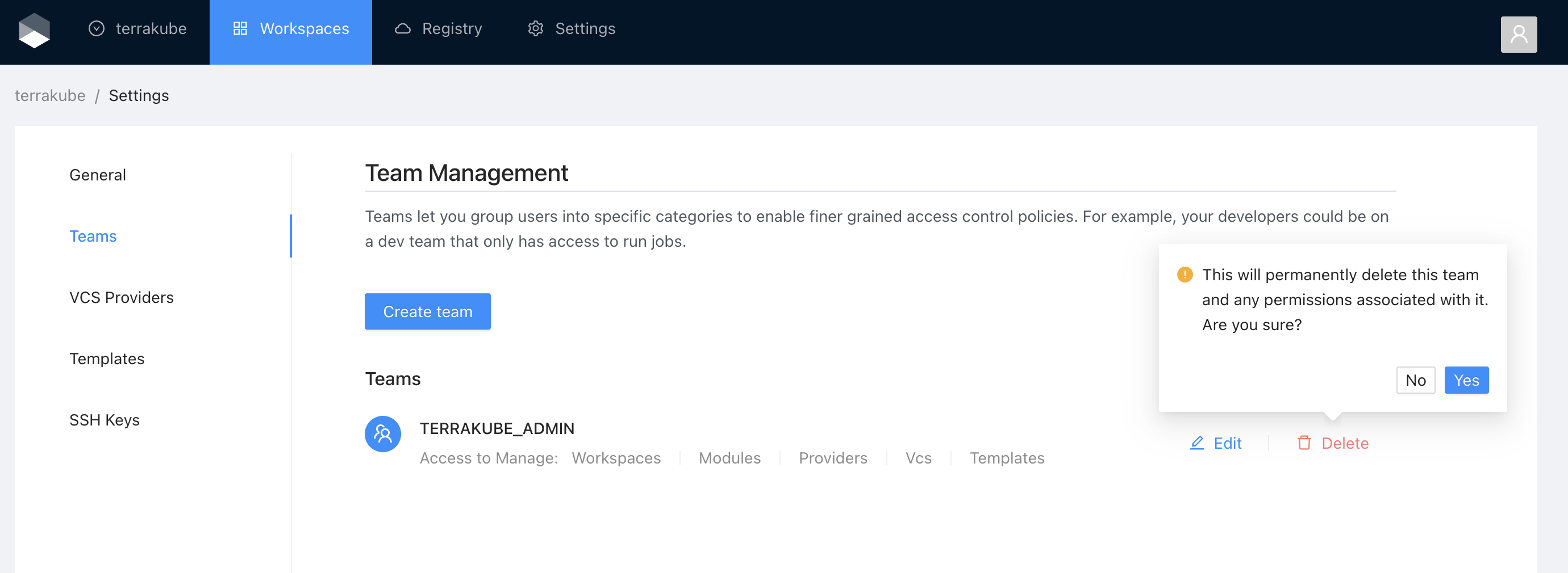 Click the **Delete** button next to the team you want to delete, and then click the Yes button to confirm the deletion. Please take in consideration the deletion is irreversible