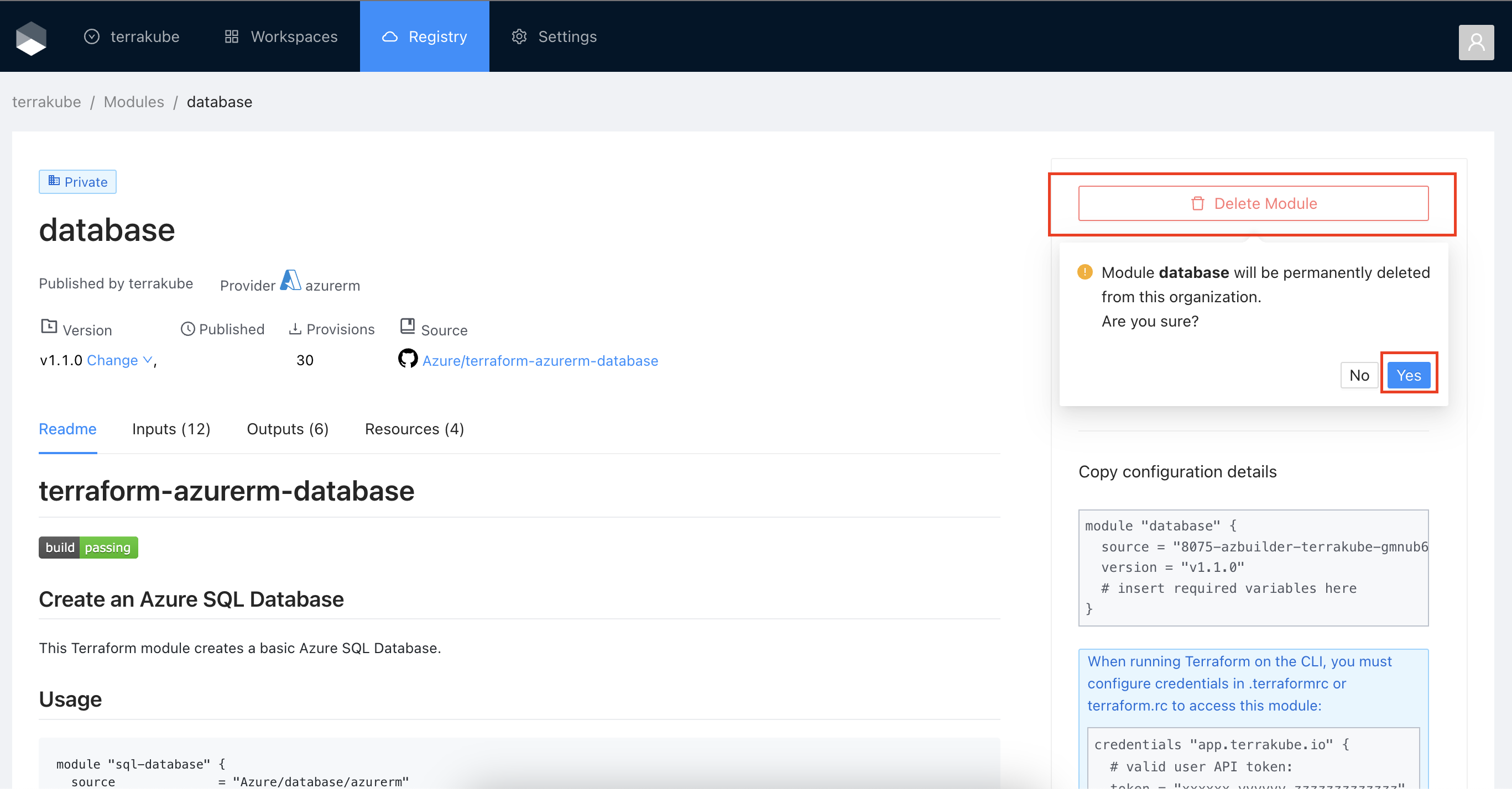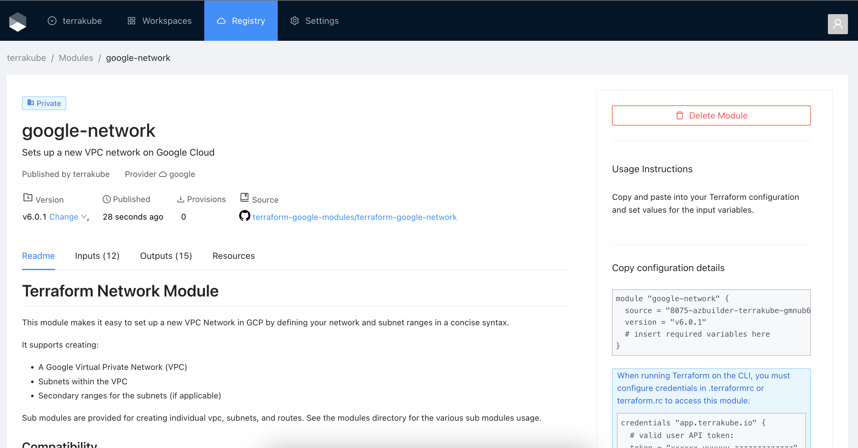 The module will be published inside the specified organization. On the details page, you can view available versions, read documentation, and copy a usage example.