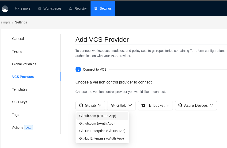 Navigate to the desired organization and click the **Settings** button, then on the left menu select **VCS Providers**