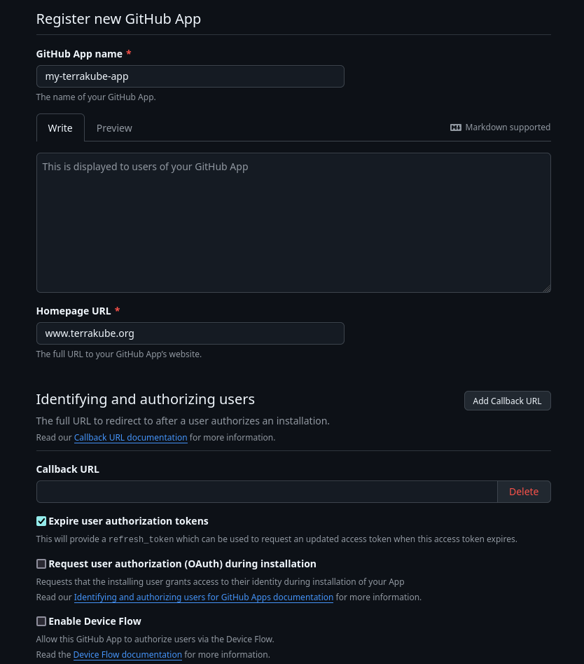 In the next page click <https://github.com/settings/apps/new> to create a new application adding the required information