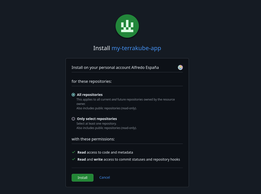 The final step will be to install the application to your Github account like this.