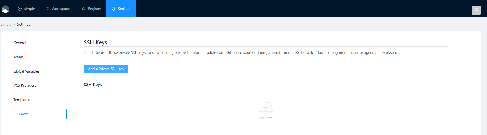 Terrakube can use SSH keys to authenticate to your private repositories. The SSH keys can be uploaded inside the settings menu.