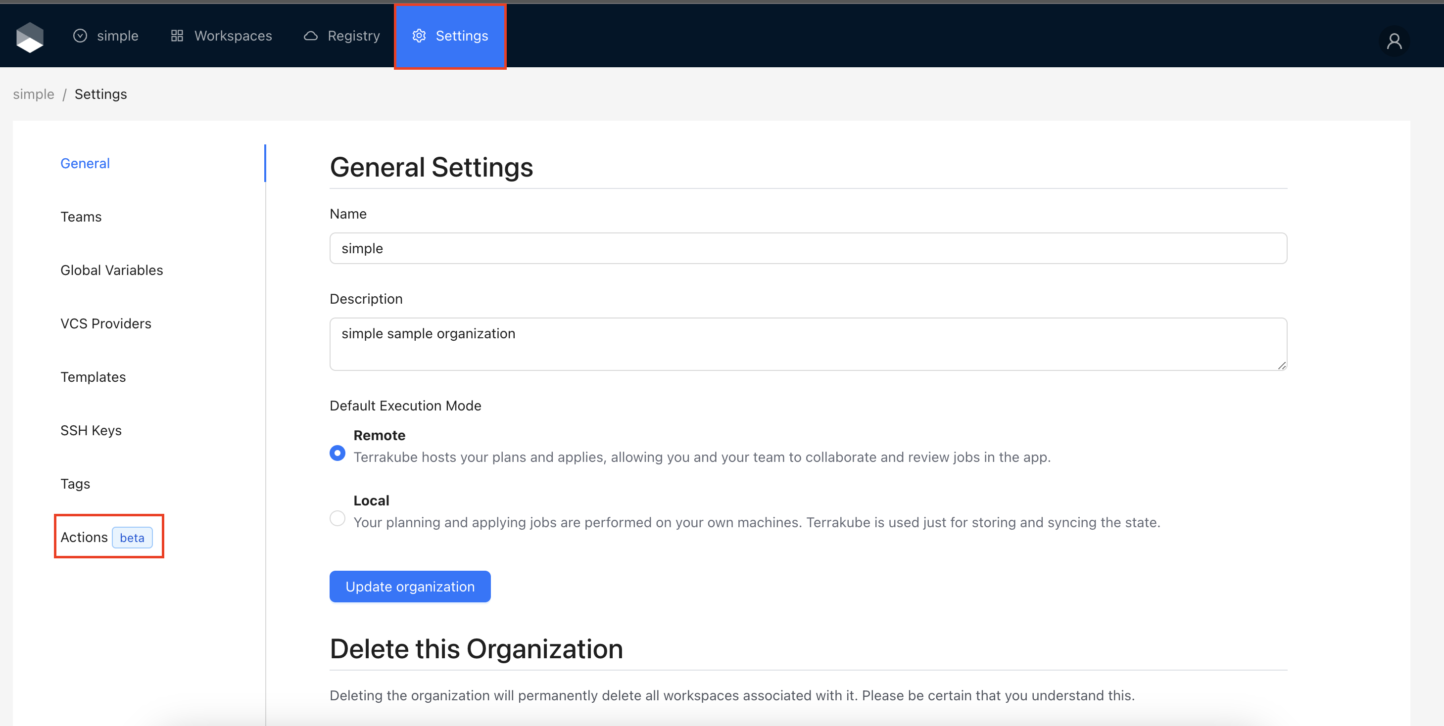 Terrakube actions allow you to extend the UI in Workspaces, functioning similarly to plugins. These actions enable you to add new functions to your Workspace, transforming it into a hub where you can monitor and manage your infrastructure and gain valuable insights. With Terrakube actions, you can quickly observe your infrastructure and apply necessary actions.