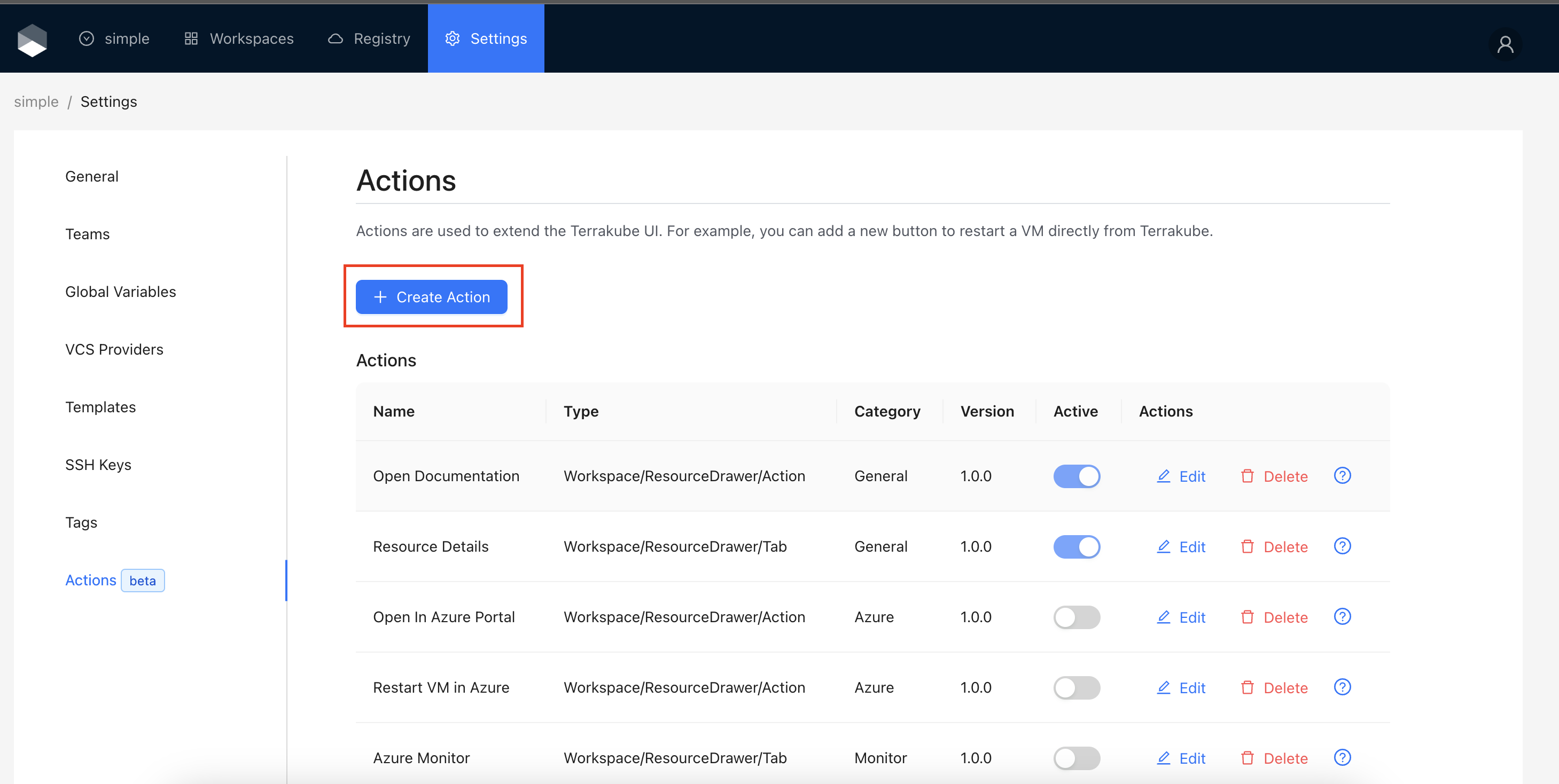 Terrakube provides several [built-in actions](https://docs.terrakube.io/user-guide/workspaces/actions/built-in-actions) that you can start using some are enabled by default. Please refer to the documentation for detailed information on each action, including usage and setup instructions.