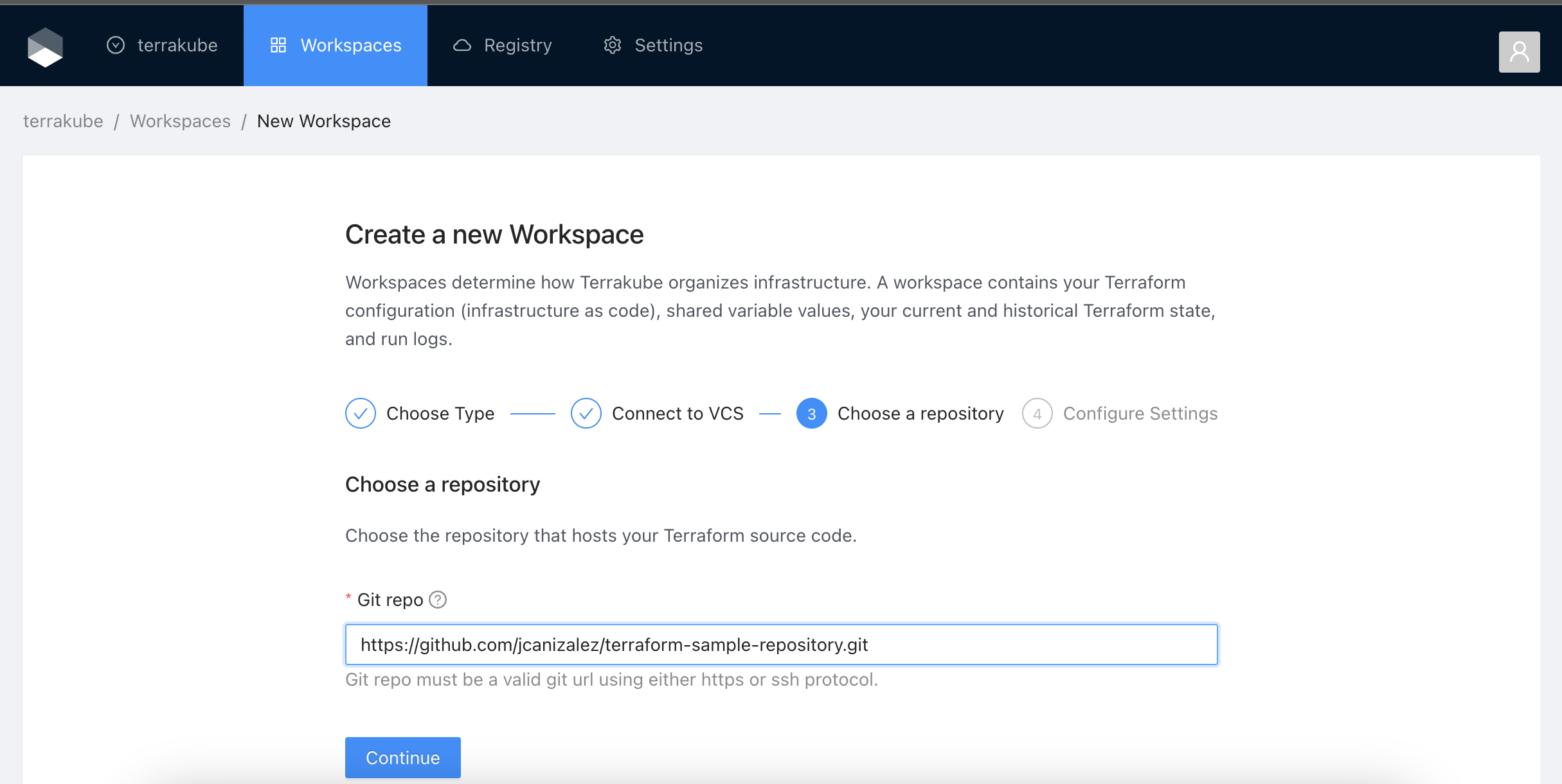 Provide the git repository URL and click the **Continue** button.
