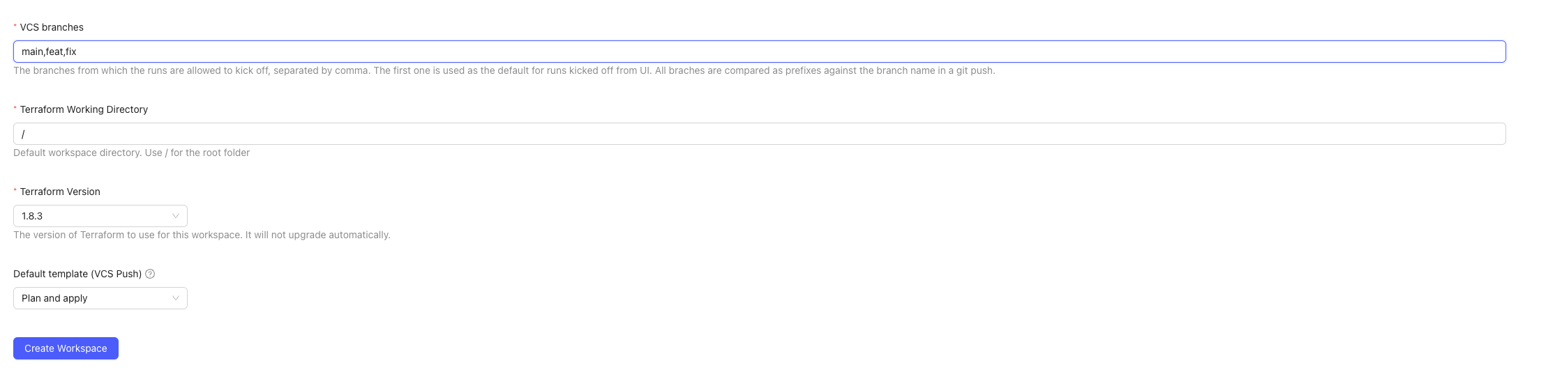 | Terraform Working Directory | Default workspace directory. Use / for the root folder                                                                                                                                                                                               |
