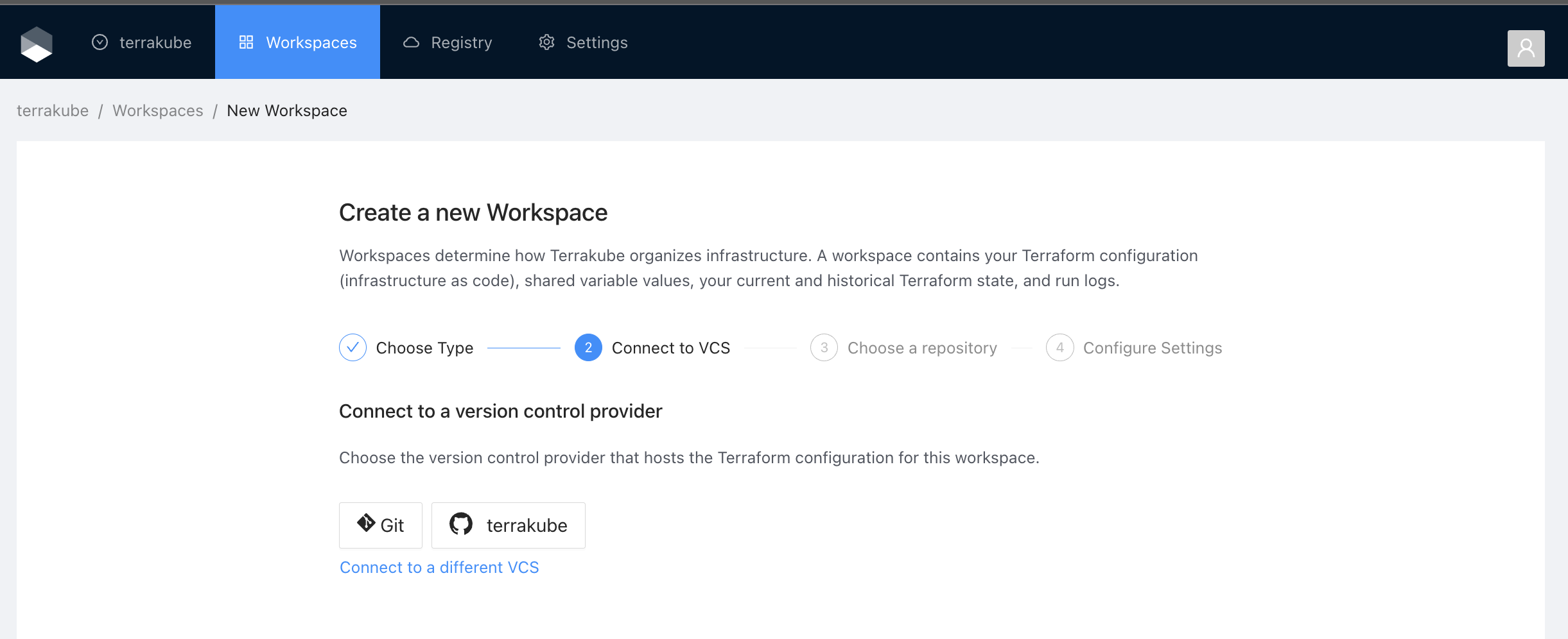 Select an existing version control provider or click **Connect to a different VCS** to configure a new one. See [vcs-providers](https://docs.terrakube.io/user-guide/vcs-providers "mention") for more details.