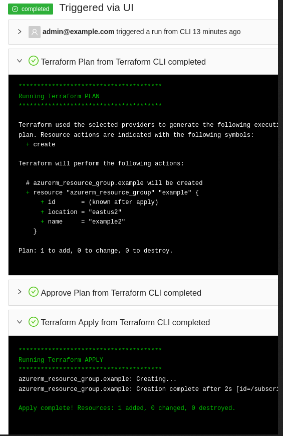 The code will also create a sample workspace with all the require environment variables that can be used to test the functionality using the CLI driven workflow.
